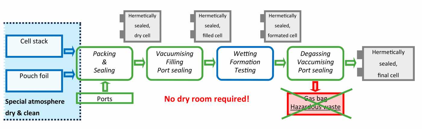 The port technology consists of pouch sealing including ports as well as filling and degassing via the ports after formation without need of a gas bag. We developed a technology for degassing simultaneously to formation (patent pending).